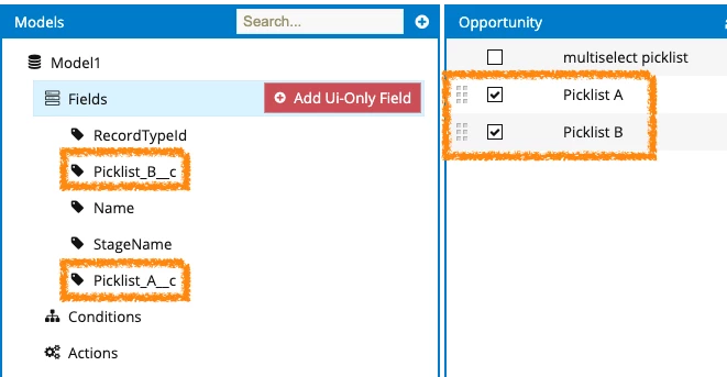 The picklist was a dependent picklist and its controlling field needed to be included in the model. This issue affects Salesforce data sources.